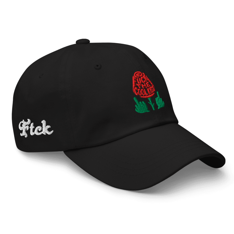 This cap ain’t for blending in. The “Middle Fingers & Petals” dad hat features our boldest embroidery yet—a red rose blooming with the words F** The Cool Kids* and flanked by two proud middle fingers made of stems. It’s a soft slap to conformity, a floral flip-off to the status quo. If they don’t get it, it wasn’t for them.